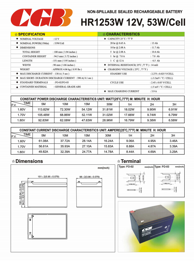 CGB长光蓄电池HR1253W是一款12V铅酸蓄电池,适用于多种备用电源和启动电源场景。以下是该型号的主要参数详情介绍: